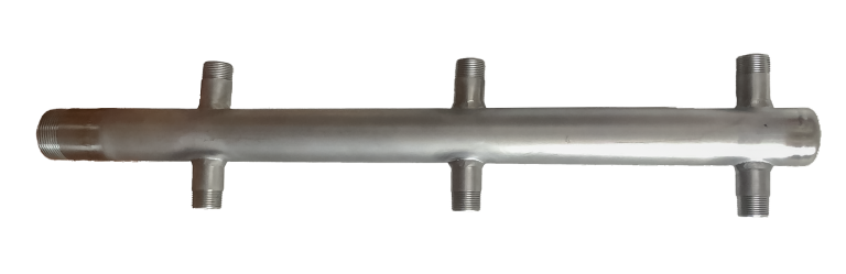 Coletor hidráulico de coluna em Inox 304 com tampo AISI 304 e saídas em dois lados.